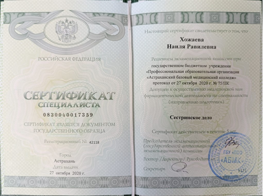 Медицинская сестра с многолетним стажем работы. Обладает устойчивыми профессиональными навыками и подтверждённой квалификацией по специальности сестринское дело.